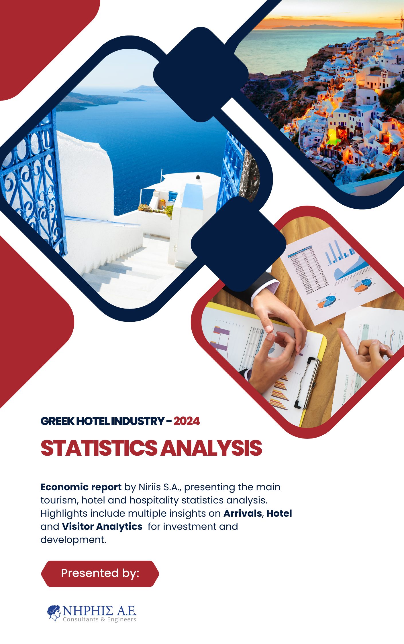 This is an extensive statistics report focusing on the analysis of the hotel and tourism industry in Greece, as compiled by NIRIIS S.A. Research. The report is highly detailed, offering insights and actionable advice across various dimensions such as tourism arrivals, revenue trends, regional and category-based analyses, and economic contributions.